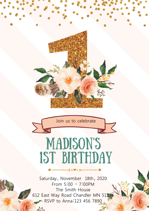 An hour to an hour and a half is the timeframe most recommended for a one year olds celebration. A party is the perfect way to express your friendship or affection for the birthday honoree. Printed with precision zazzle offers custom themes for your special event. 1st birthday first beautiful floral invitation card zazzle from 1st year birthday invitation card template 1st birthday invitations girl template btk028vi babies from 1st year birthday invitation card template.