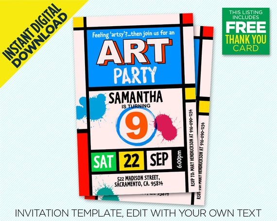 Easily editable printable. Customize art party birthday invitation. Art art party invitation get your free printable. This kind of template is also easy to edit even by those having no design skills.