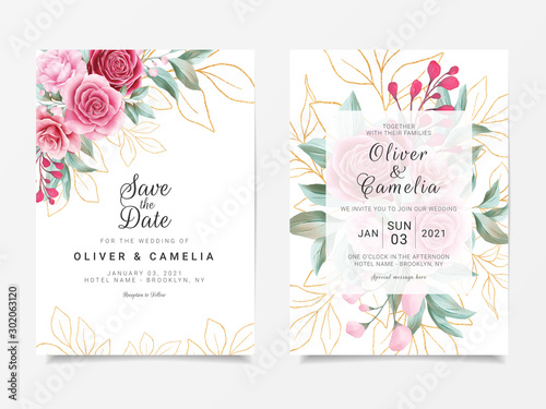 Tropical gold wedding card template. Weddings can get expensive. Thousands of new high quality pictures added every day. Foliage wedding invitation template set with burgundy and brown watercolor floral bouquet and border decoration.