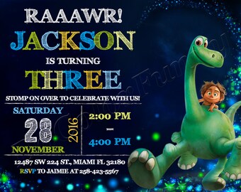 Fill in your party info using your favorite font style and color and try digging up the dinosaurs who migrated into the animals category of the stickers menu. A self editable personalized dinosaur birthday invitation is a sample template that you can edit online print and then distribute to those who you would like to attend the birthday party of your child. The good dinosaur opens in thearter everywhere november 25 2015. The good dinosaur invitation template.