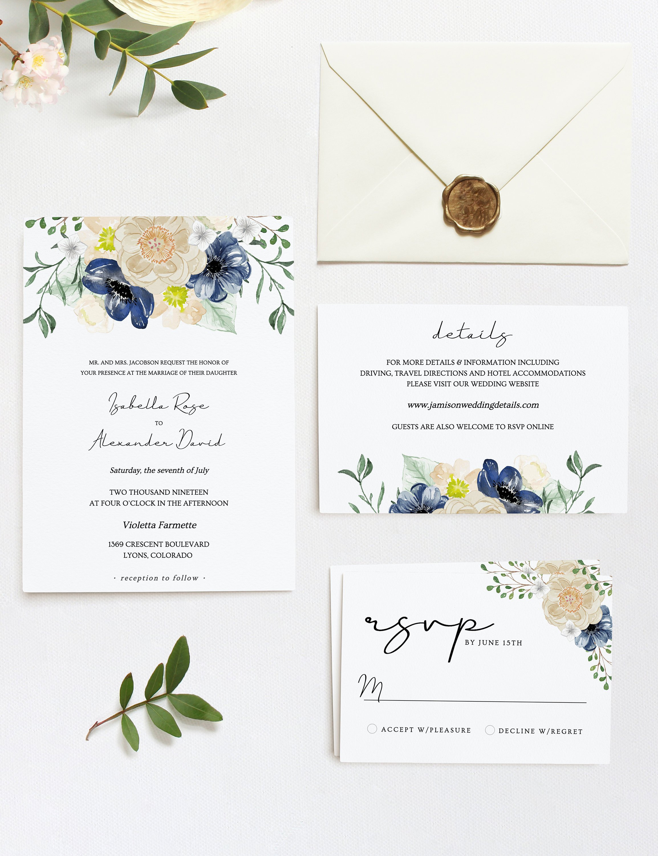 We also offer many different printable wedding invitations on our site so check us out now and get to printing. Watercolor creamy wedding invitation card template set with golden floral decoration. Our collection of blue and white invitation designs means you can almost always find that perfect invitation or other invite styles that truly speak to you and your personality. An rsvp card is included.