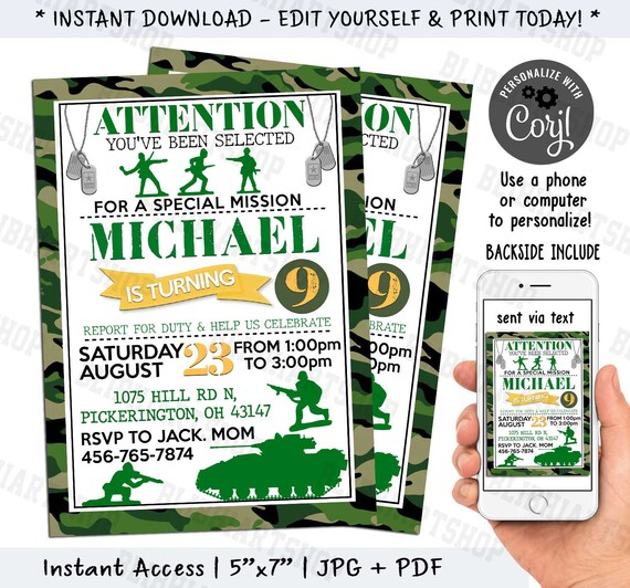Download free printable camo birthday party kits templates. Army party invitation template green camo 750 add to cart checkout added to cart instantly download this army party invitation template for your boot camp or army party. Click here to browse the available invitations and edit it online with drevio canvas. Free printable downloadable invitations templates for your next awesome party.