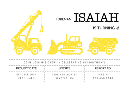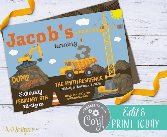 Customize texts and fonts choose add a photo options make one of our hundreds of designs your own. Youll find some truck images such as loader excavator backhoe bulldozer and dump truck. The templates are dominated with yellow and black as the colors of construction. Find inspiration for birthday parties baby showers bridal showers graduation parties first birthday parties and more.