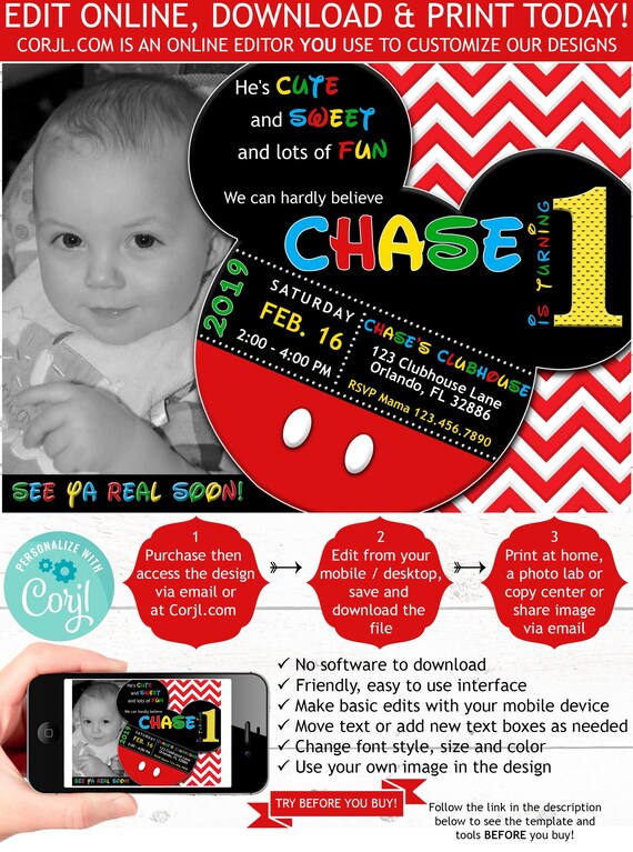 Mickey Mouse 1st Birthday Invitation With Photo Chevron Etsy