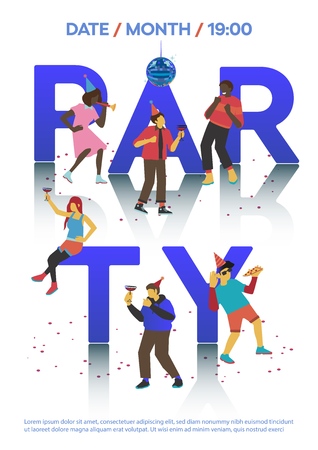 Vector Illustration Of Party Invitation Template With Big Word And Dancing And Having Fun Young Joyful Men And Women With Cocktails And Pizza Under Disco Ball In Flat Style On White Background