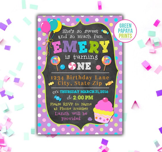 Candy Birthday Invitation First Birthday Printable Cupcake Candyland Invitation Girl Bright Candy Lollipop Digital File By Green Papaya Prints Catch My Party
