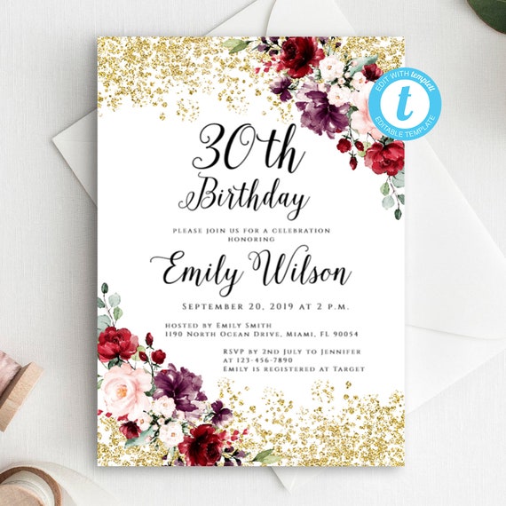 Free Editable Birthday Party Invitation Template Unicorn Gold Glitter Watercolor Flowers Instant Download Printable Birthday Party Invitations Free Birthday Party Invitation Templates Unicorn Invitations