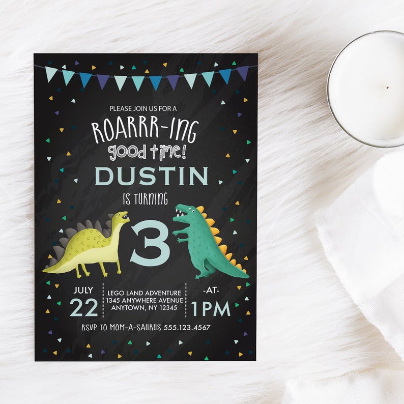 With our variety of designs for every party theme customizable text and fonts you can fine tune your invitation to keep the secret of a surprise ask for charity donations in lieu of gifts include parking instructions whatever will keep your event on track. Our dinosaur birthday invitations are a blast from the way past. You can decorate the room as in the ancient dinosaur age. Click here to browse the available invitations and edit it online with drevio canvas.