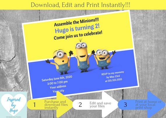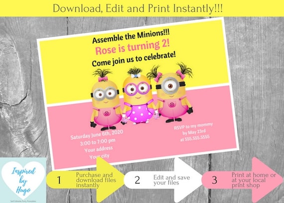 Click here to browse the available invitations and edit it online with drevio canvas. Each template provides a white blank space where you can write the wording and information there. From shop cecicisstore 600. Aug 31 2016 explore beatriz guzmans board minion invitation on pinterest.