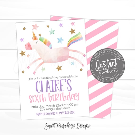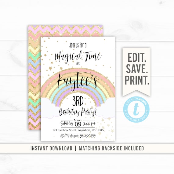 Free Editable Birthday Party Invitation Template Unicorn Magical Day Rainbow Gold Instant Download Printable Instantly Personalize Printable Market