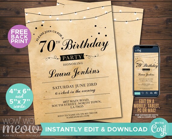 Editable 70th Birthday Party Invitation Template Cheers To 70 Years 7 70th Birthday Invitations Birthday Party Invitation Templates 60th Birthday Invitations