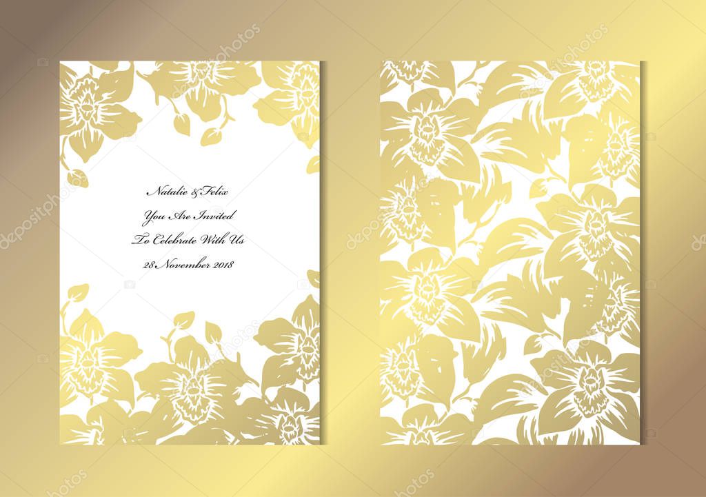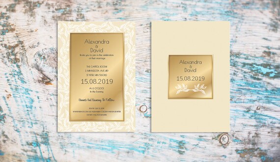 Elegant gold design invitation template. The proper placement of design materials and the way that the entire wedding invitation theme is presented are just some of the factors that make up an effective elegant wedding invitation. Elegant wedding invitations and other wedding postcards provide a timeless aesthetic that can be used through generations. Browse our collection of elegant gold design invitation template and create a stunning design even if youre not a designer. Download print or send online for free.