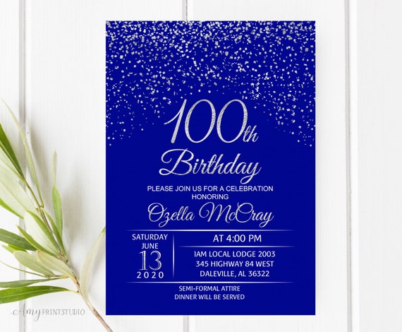 100th Birthday Invitation Royal Blue Silver Birthday Etsy