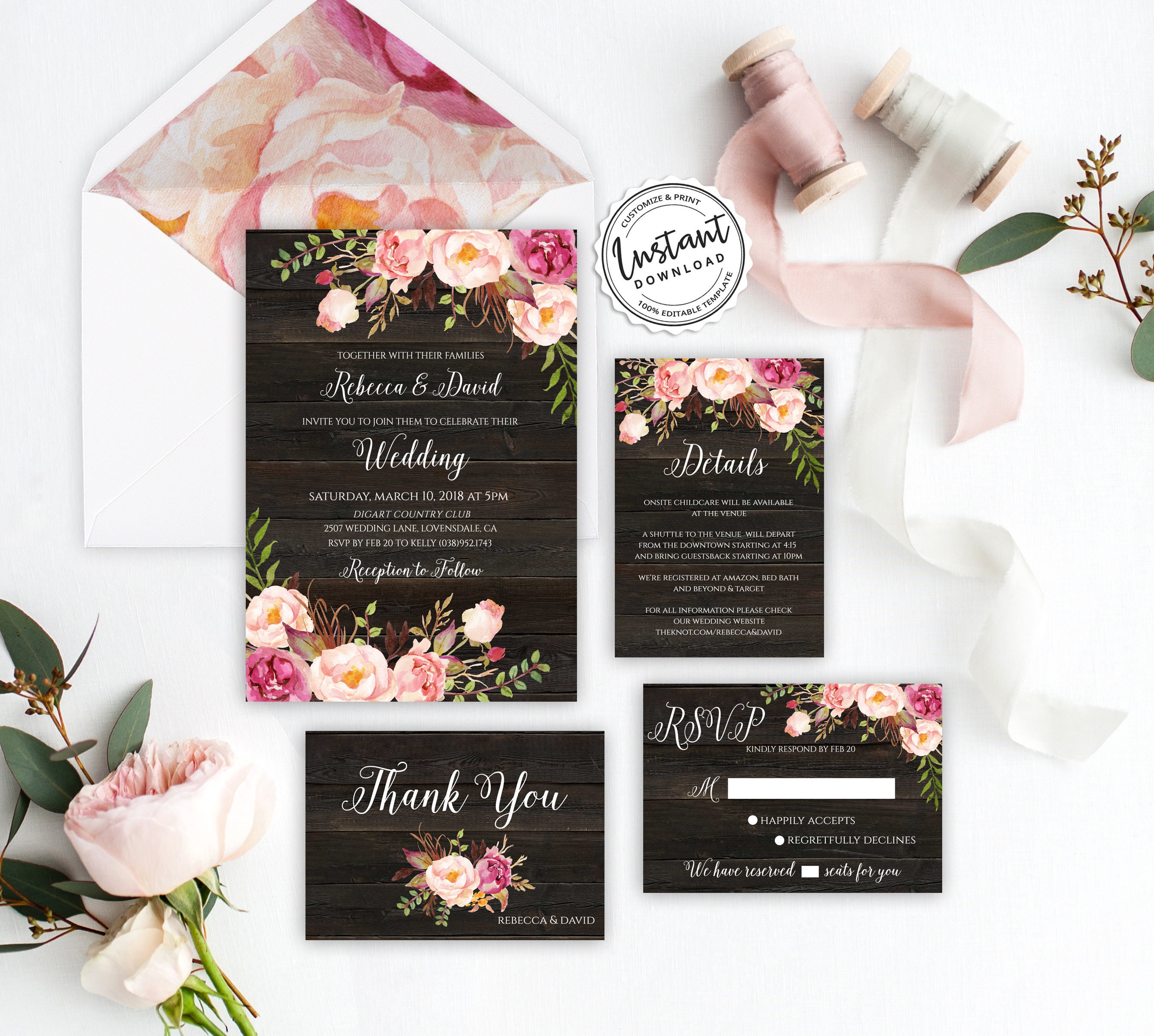 Rustic Wedding Invitation Template Set Printable Botanical Floral Boho Wedding Invitation Suite Personalized Printable Pdf Digital Invites By Always The Hostess Catch My Party