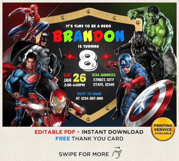 He is one of the most favourite character in marvel cinematic universe portrayed by robert downey jr his movie is always successful from iron movie until end game. Download free chalkboard avenger birthday invitation template. Superman batman robin spiderman iron man green lantern green hornet fantastic four and so much more. For this special invitation i used and placed a complete sets iron man and his signature mark xliv to lii suits along with nerve wracking scene of iron man fighting.