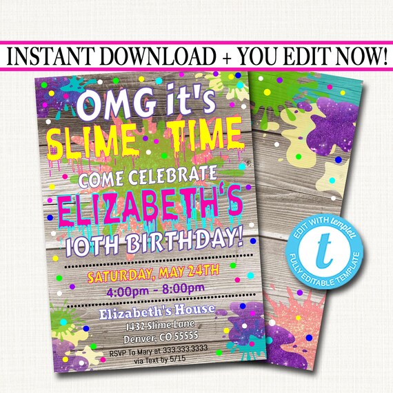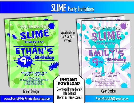 Oct 16 2017 we love this slime party invitation. Instantly download this slime party invitations template for your slime theme birthday party. Slime is a hot party theme for all primary or elementary aged kids. Aside from making sure that every aspect of the event is perfect you also have to get the word out to everybody and get them excited to attend.