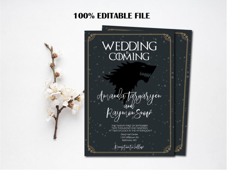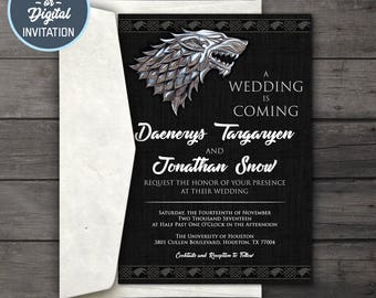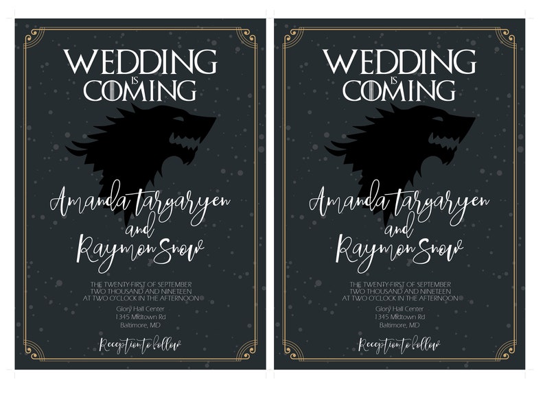 Game of thrones wedding invitation template. Make hosting your claim to fame by getting expert tips from evite party ideasfor awards show season get the full story from our showstopping awards show viewing party guideget guests involved by downloading our free printable film award show ballots annually updated with all the nominees our awards party bingo cards and awards party bingo. May 1 2014 printable game of thrones birthday party invitation got. Check out our game thrones printable wedding invitation selection for the very best in unique or custom handmade pieces from our shops. Apr 22 2020 explore suzyschettlers board game of thronesdragons themed wedding followed by 73209 people on pinterest.
