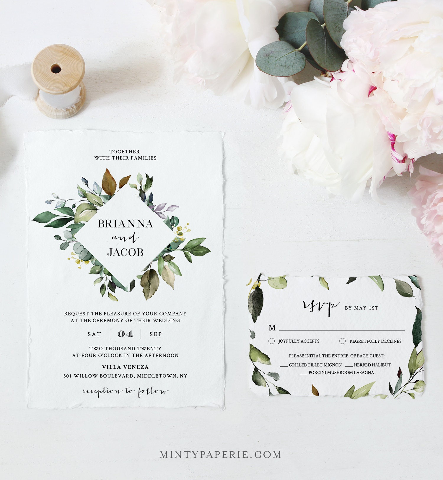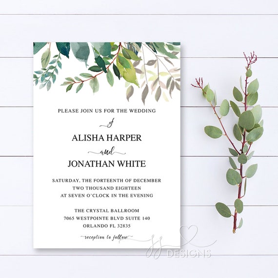 Plus all zazzle invitations are available in a variety of options. This greenery wedding invitation template features lush watercolor artwork of botanicals. Favorite add to. Greenery wedding invitation template printable invite rsvp and details instant download 100 editable text diy boho wreath 056b mintypaperieshop.