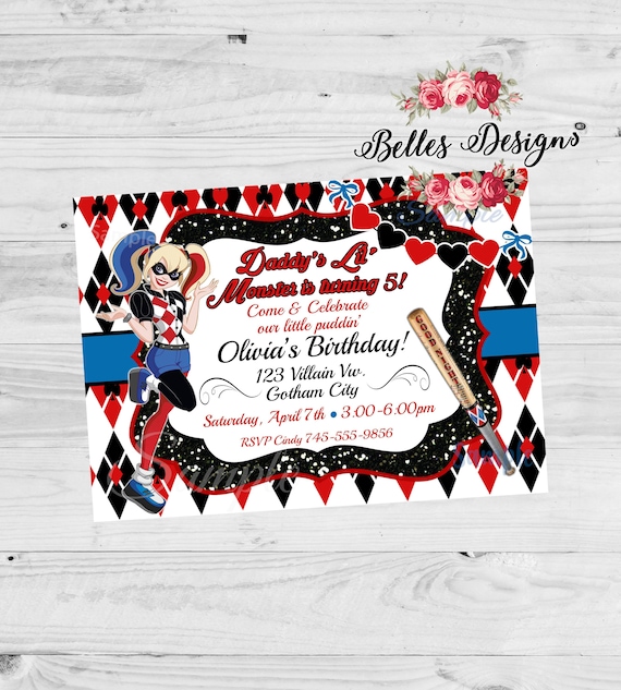Harley quinn birthday invitation template. Dc super hero girls birthday invitation custom personalised printable harley quinn supergirl wonder woman batgirl birthday party supplies cocodigitals. Free printable harley quinn birthday invitations planning a birthday party for your little one also makes you feel like a big task but you dont need to worry about how to get birthday invitations. 5 out of. Harley quinn invitation harley quinn birthday invitations suicide squad invitation girls superhero invitations digital file.