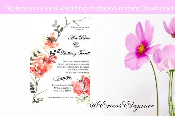 Japanese wedding invitation template. Botanic card design concept. Watercolor branch on wedding invitation template. Wedding invitation set with pink flower garden watercolor. From classic to casual traditional to modern add your custom details in beautiful fonts and colors.