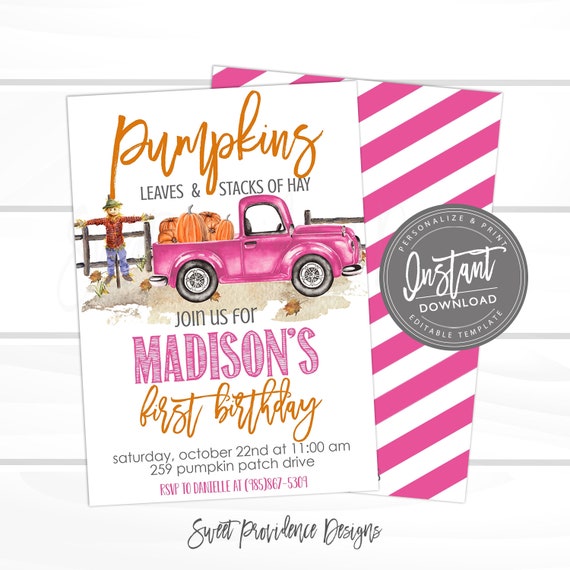 Pumpkin Birthday Invitation Pumpkin Pink Truck Pumpkin Patch Fall Invitation Editable Girl Party Invitation Template Instant Download By Sweet Providence Designs Catch My Party