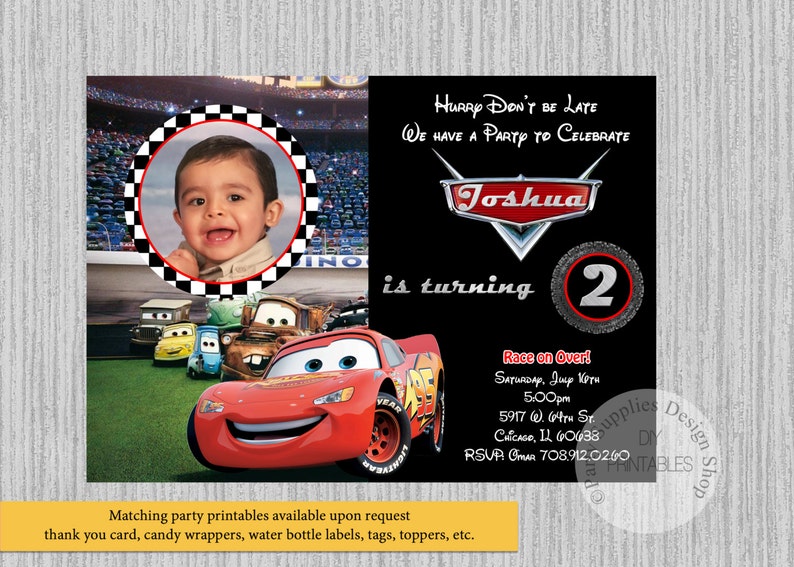 If you want to celebrate your kids birthday party our cars 3 birthday invitation can be a great ideas for your next invitation. Disney cars birthday party invitation lightning mcqueen invitation tow mater invite cars party custom printable digital file designs2celebrate. This invitation has lightning mcqueen and says speed on over. Of course its free.