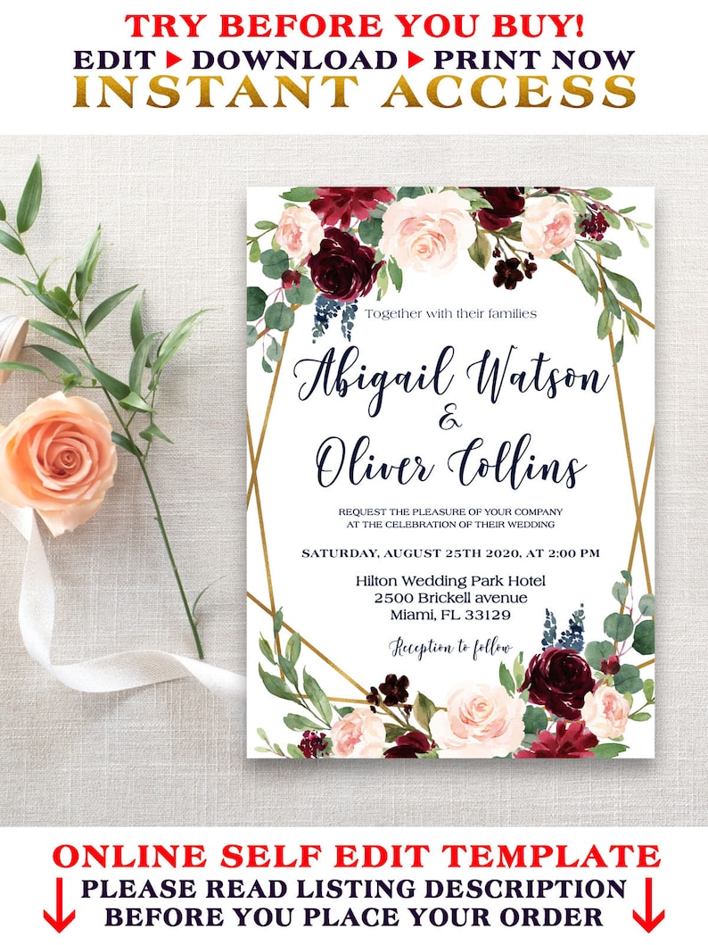 No installation of any software or fonts is necessary. This is an editable template and is accessed using the in browser app templett. Marsala wedding invitation template printable burgundy floral invite maroon boho wedding invites merlot watercolor flowers isl 010 blushpresswedding. After payment you will receive an email with the file links to access the templates.