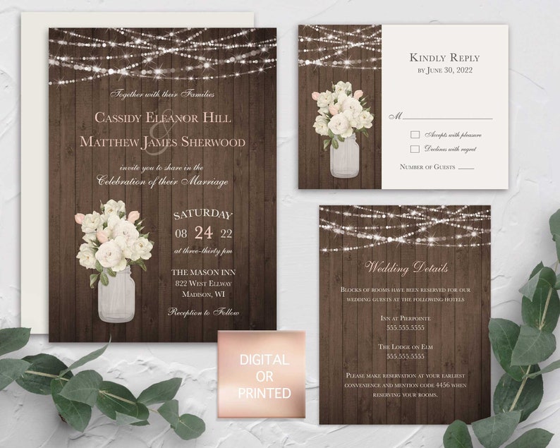 Mason jar wedding invitation rustic wedding invitations babys breath country wedding invitations affordable barn wood wedding card level33graphics from shop level33graphics. Mason jar wedding invitation template rustic wedding invites wildflower wedding printable set floral string lights country wedding suite notedoccasions. Create rustic mason jar wedding invitation. Mason jar wedding invitations faqs.