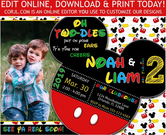 Mickey Mouse Twins Two Dles Twodles Photo Invite 2nd Birthday Etsy