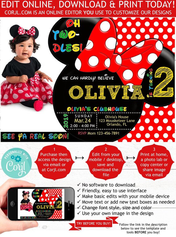 Minnie mouse 2nd birthday invitation template. This minnie mouse 2nd birthday invitation is very easy to use. Download personalized minnie mouse birthday invitation. Minnie mouse invitation minnie mouse 2nd birthday invitation printable oh twodles invite girl minnie mouse invite personalized invite. The most popular color.