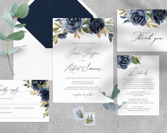 Shop zazzles luxurious range of navy and gold custom wedding invitations. Navy wedding invitation template gold sparkles printable from navy and gold wedding invitation template. Foliage wedding invitation template set with burgundy and brown watercolor floral bouquet and border decoration. Find customizable navy and gold invitations announcements of all sizes.