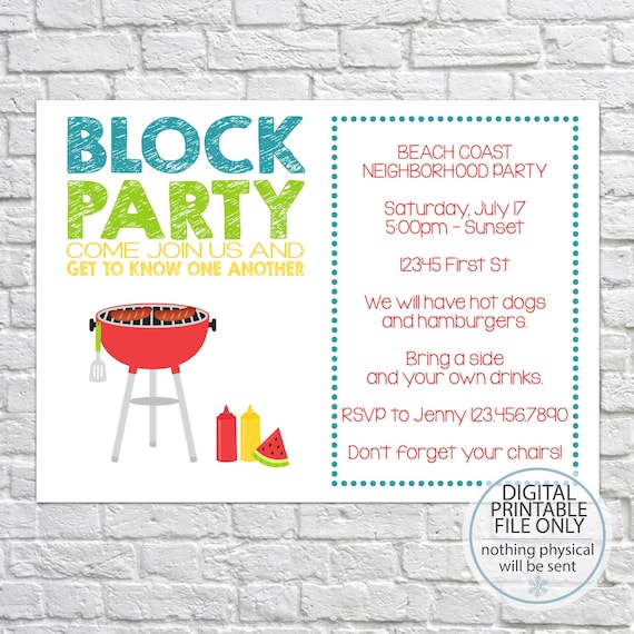 This free printable neighborhood block party set includes invitations cupcake toppers name tags drink wraps favor tags food tents a banner and more. Neighborhood block party invitation free printable july 6 2015 by vanessa barker 1 comment use this free printable neighborhood block party invitation plus other great tips to make your next party stress and hassle free. It is a celebration where the attendees are the members of an individual block or community which is aimed to do the interaction among them. When we purchased our house three years ago the realtor had told us what a great neighbourhood we had and how they threw block parties at the end of summer which i of course thought was the bees.