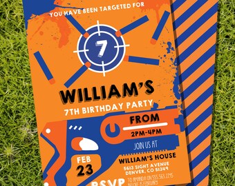 Its a nerf birthday party this free invitation has the nerf logo nerf colors and little targets for the party theme. Nerf birthday party invitation inspired by hue from free nerf gun party invitations printable. Party invitations for your celebration. And from now on this can be a first sample picture.