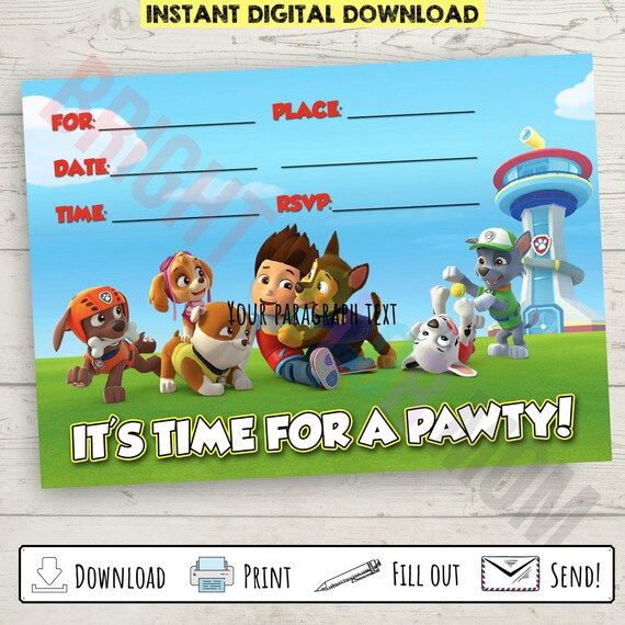 Paw patrol invitation paw patrol custom birthday invitation personalized printable digital card upon purchasing you will receive a printable digital file in the form of a 300 dpi high resolution jpeg or pdf 4x6 or 5x7.