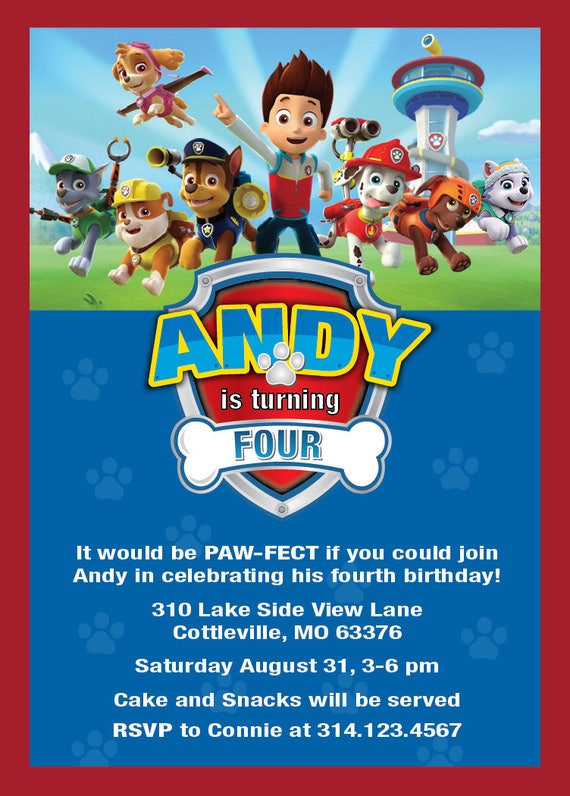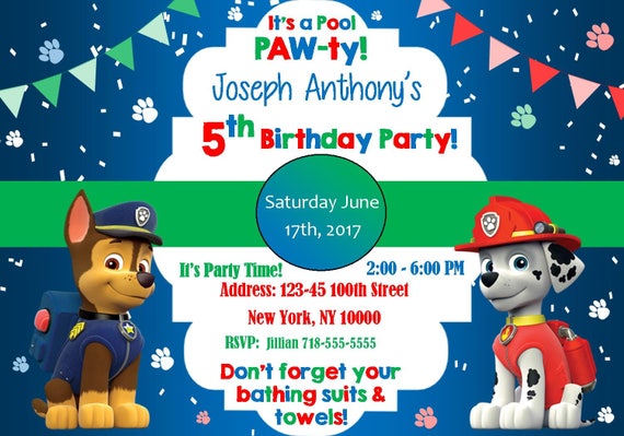 Paw patrol birthday invitations template paw patrol invite paw patrol birthday party printable paw patrol makemedesign this item listing is for a customized birthday invite in digital file onlyyou will received a high resolution jpeg pdf files in 300 dpi via email within 12 hours. Jan 5 2015 paw patrol invitation editable text by colorandprints on etsy. From shop invitefactoryforfun 700 free. Paw patrol invitation paw ty pool party pool bash birthday invitation.