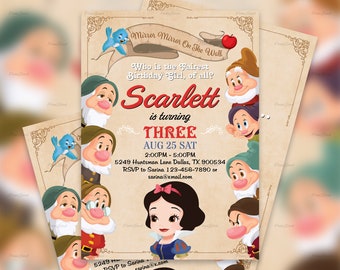 So you dont need to go somewhere to buy the invitation. She is always watching snow white movies the classic one is the cartoon version and the newest are mirror mirror and snow white and the seven hunstman. The snow white character is owned and copyrighted by disney. 5 x 7 w x h fonts used on image sample.