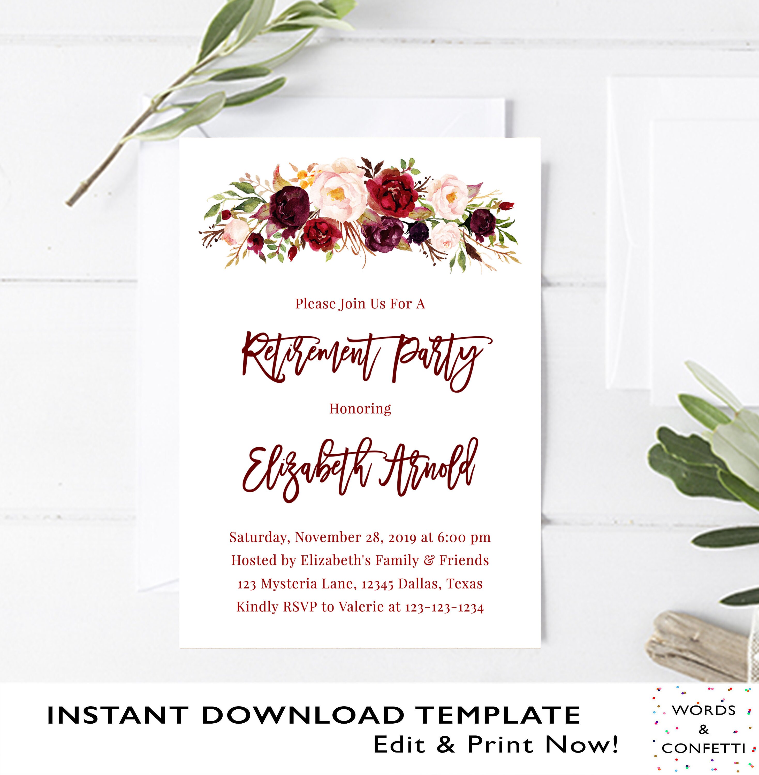 Floral Burgundy Retirement Party Invitation Retirement Etsy