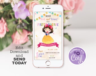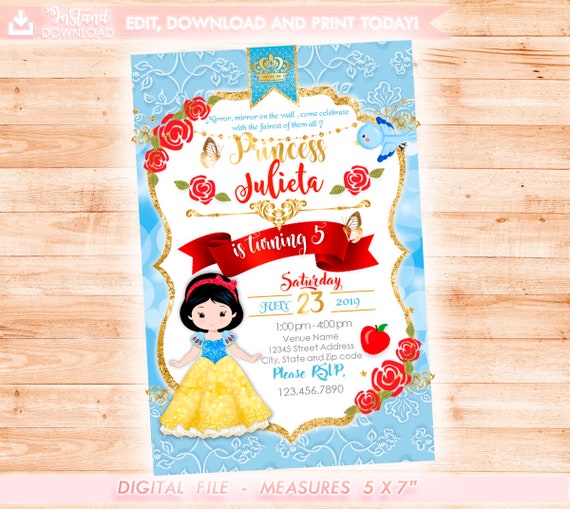 Download free princess snow white invitation templates. There are a lot of designs of the snow white and seven dwarfs with photo invitation template available on this website. Download the template and start customize it easily and spread to the world. Printable snow white birthday invitation editable princess party invite modern girls snow white birthday party invite 0109 thepaperfoxstudioza.