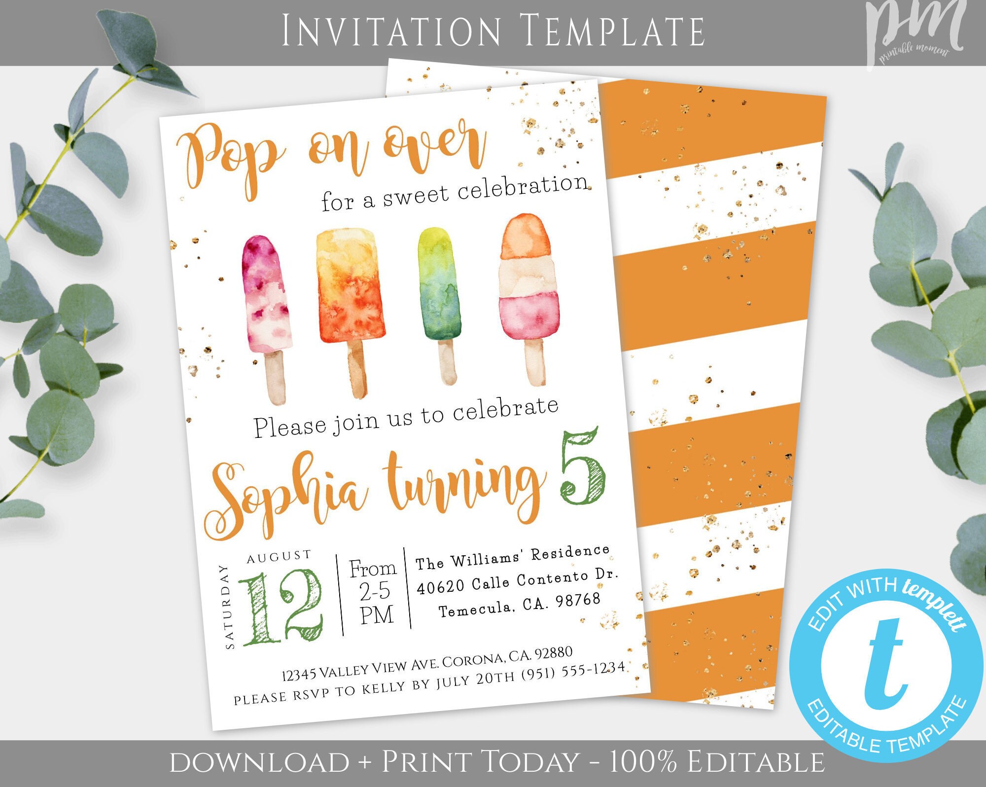 Get friends in the mood for outdoorsy fun with creative glamping party invitations shaped like popsicles. Easily editable printable. Available in 4x6 5x7. Download the free printable popsicle summer party invitations.