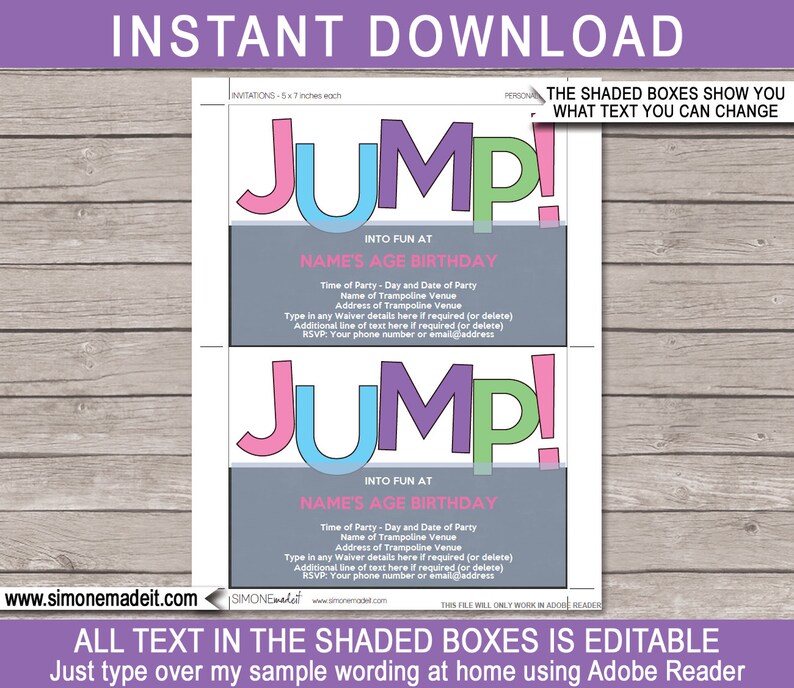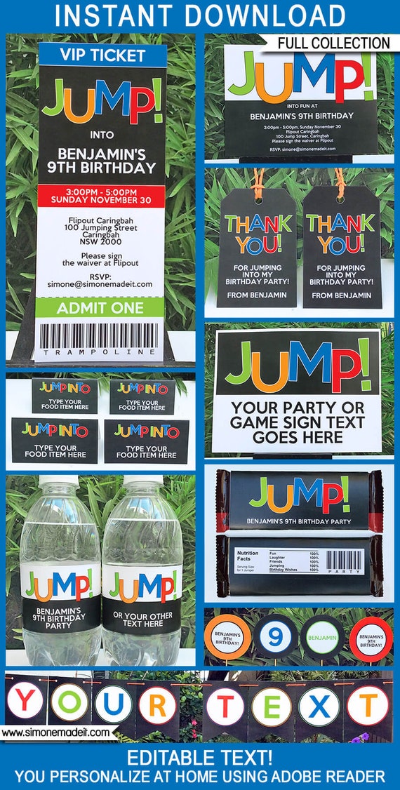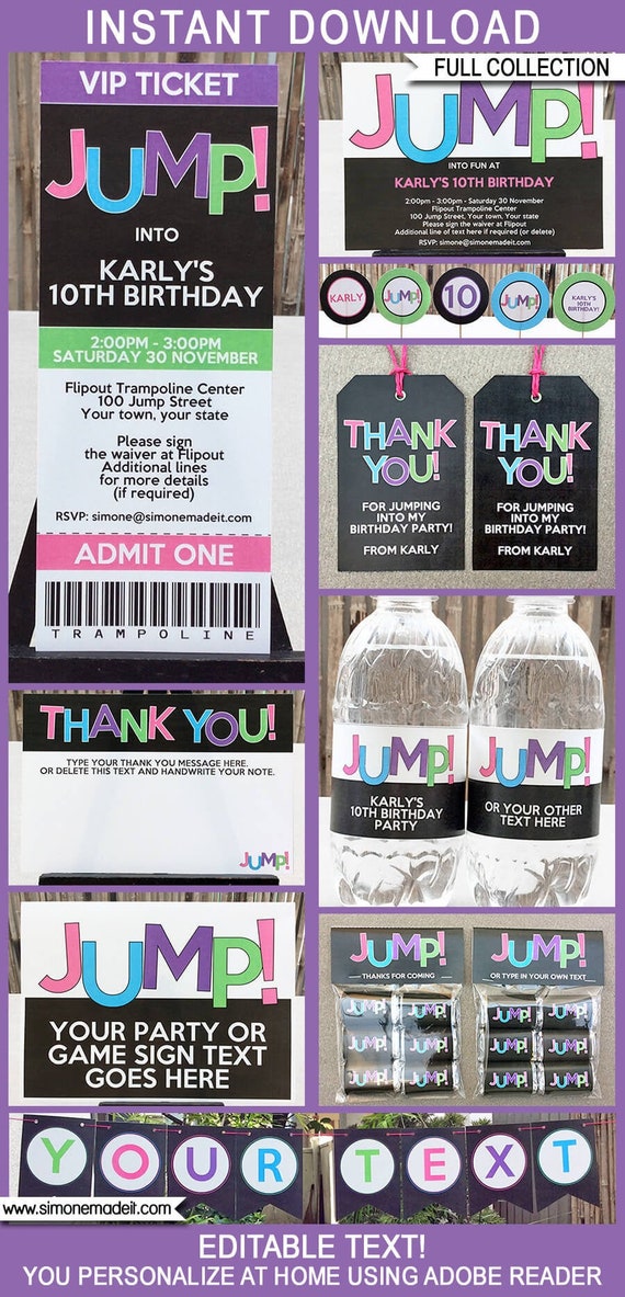 We have blank jump trampoline invitation template which you can fill it with your birthday party wording. Comes in portrait version you can easily print then edit the invitation with manual writing. Trampoline birthday party ticket invitation printable template jump trampoline park party instant download with editable text you edit simonemadeit. From shop simonemadeit.