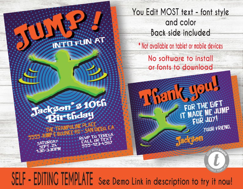 The only text you cannot change on these invitations is the jump text. Jump birthday invitations diy instant printable digital invite free thank you card trampoline party light dark swcreationsco.