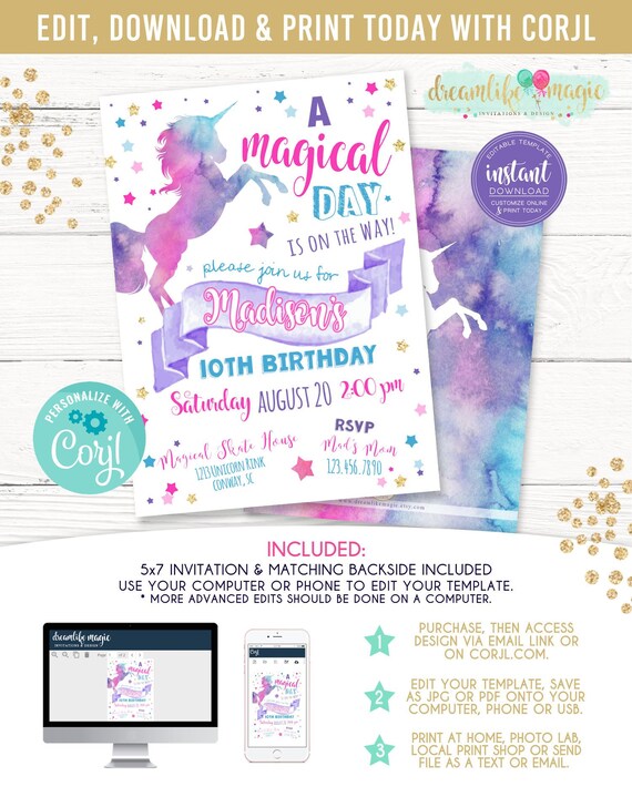 Perfect for kids birthday parties of all ages our unicorn invitation templates help you celebrate your milestone in style. If you want to celebrate your dotter or your invitation using unicorn theme you can use and download our birthday invitation. Free printable unicorn first birthday. Free editable birthday party invitation template unicorn magical day rainbow gold instant download printable instantly personalize.