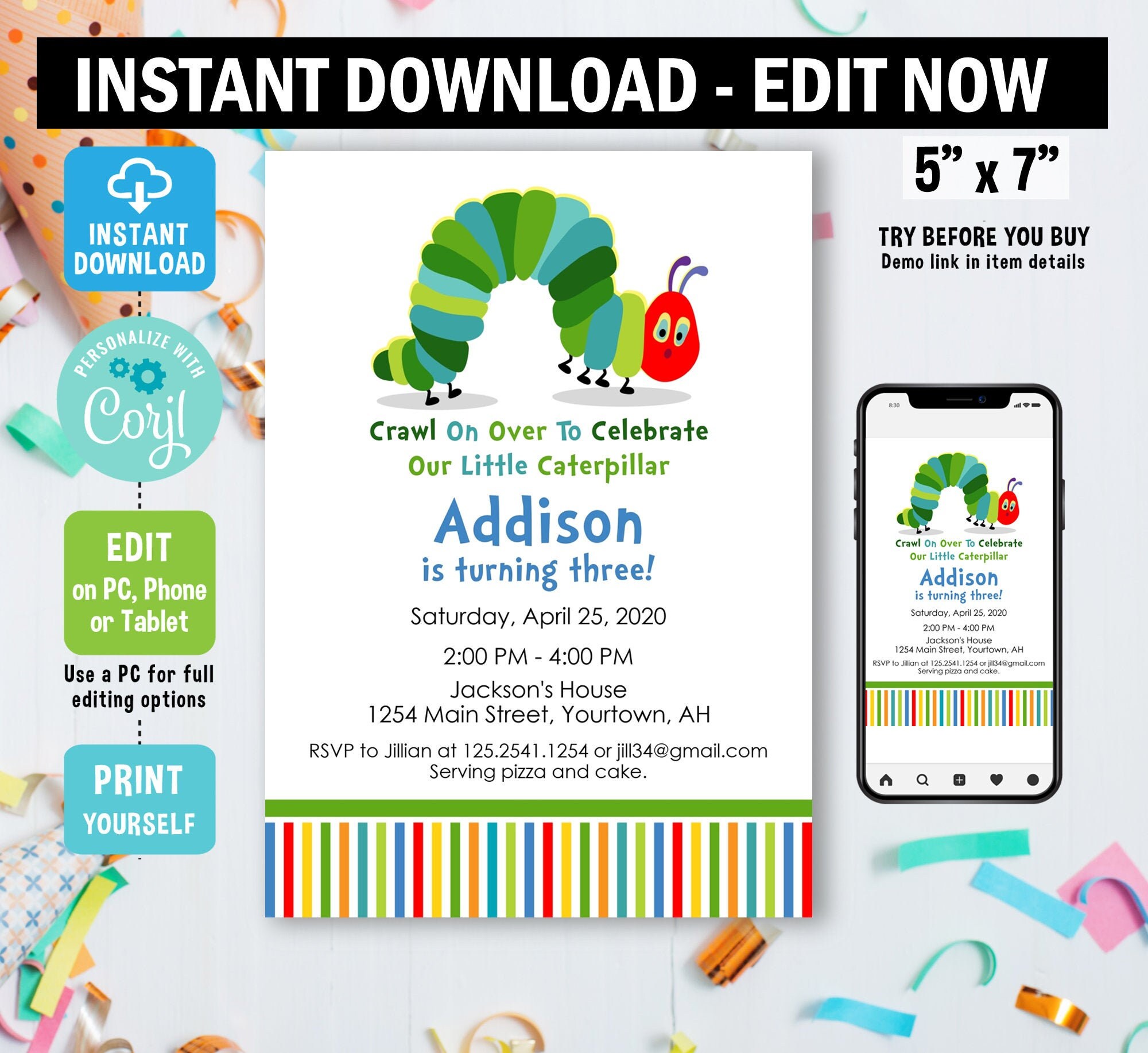 Very hungry caterpillar birthday invitation template. Very hungry caterpillar party invitation editing tutorial de su mama july 13 2014 at 1022 am get so many emails and questions about how to edit my very hungry caterpillar party invitation free printable that i posted for our sons first birthday. A terrific t rex birthday party for little boys. Click here to browse the available invitations and edit it online with drevio canvas. Well heres very hungry caterpillar 1st invitation template.