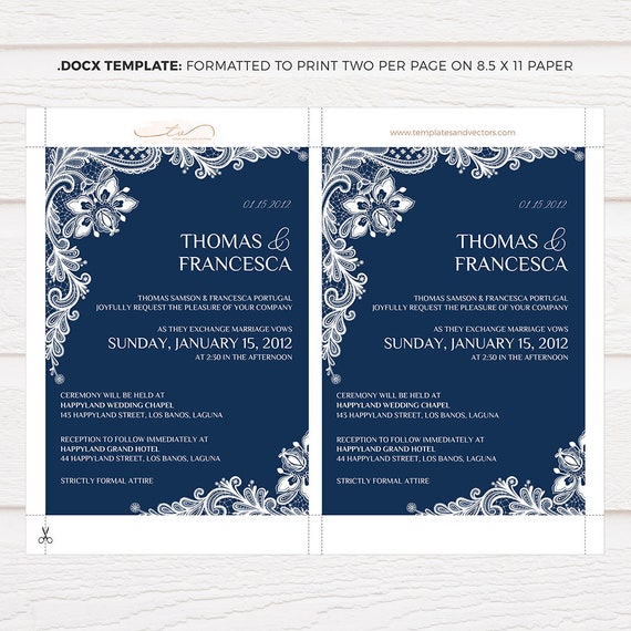Wedding invitation template navy blue. For an extra personal. Coordinating rsvp reception invitation wedding programs menu and thank you card templates are available in our shop. 5 x 7 wedding invitation 2 invitations per page microsoft word document text font colors style are editable free. The full set offers 2 backgrounds the information card invitation menu rsvp name and thank you cards.
