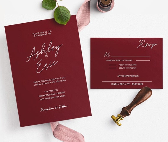 Foliage wedding invitation template set with burgundy and brown watercolor floral bouquet and border decoration. Invite your loved ones to your celebration with a flourish with this stylish design. They are all easily editable in all versions of microsoft word. Easily editable printable.