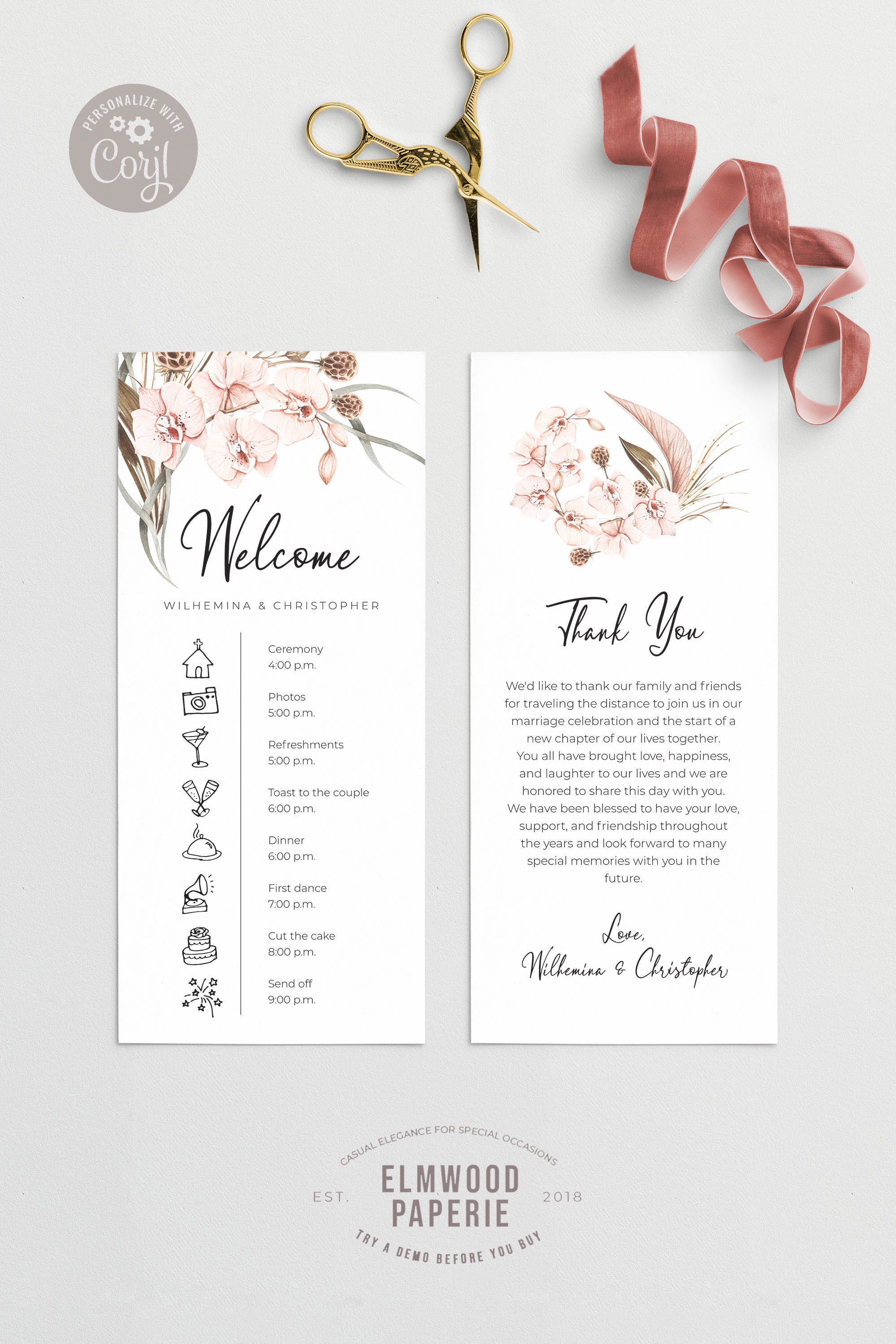All of the wedding templates are free and extremely easy to use. From classic to casual traditional to modern add your custom details in beautiful fonts and colors. Adjust the order add titles and names then print to hand out before the ceremony. Botanic illustration for card composition design.