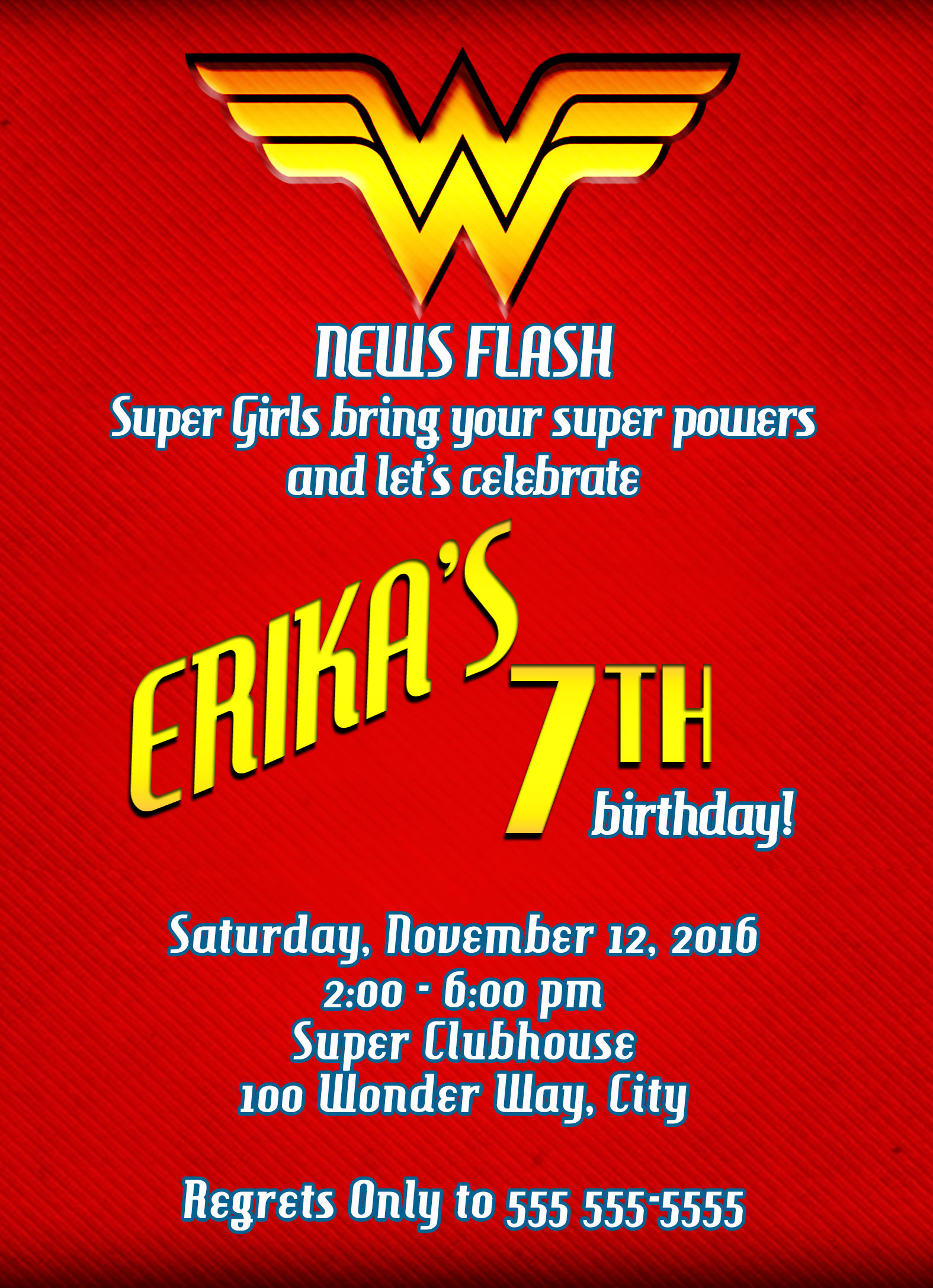 Well you can use the wonder woman invitation for a quick access. Planning a wonder woman themed birthday party. The download comes with a jpeg and a pdf file. Use the customizing tools to tweak the font or add images from the stickers menu.